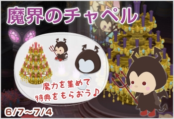 魔力を集めて、魔界のキャンドルタワーに火を灯そう 魔 界 の チ ャ ペ ル o○o。.。o○o。.。o○o。.。o○o。.。o○o。.。o○o。.。o○o ぼくの名前は、デビオ。 魔界のチャペルに住んでいるんだ。 天空のチャペルに続き、数百年の時を超え、 魔界のチャペルも開かれたよ。 でも、悪い魔法使いが魔界のチャペルを封印しようとしているんだ。 だから、魔界の魔力をみんなで集めて、 キャンドルツリーに火を灯してくれないかな。 全てのキャンドルに火が灯った時、 悪い魔法使いから魔界のチャペルを守ることができるんだ。 デビオより 魔力を集めて、魔界のキャンドルタワーに火を灯そう♪ 期間 6月7日(木)15:00 ~ 7月4日(水)23:59 ※予定 イベントの流れ 1 イベント参加用アイテムを着用します。 (アイテムの種類に応じて、1日の参加上限回数が異なります) 2 「魔界のチャペル」の魔力を集めるミニゲーム「デビオの魔力キャッチ」で 獲得した合計点数に応じて、段階的に特典がもらえます。 ミニゲームでもらえる主な特典 魔界のデビオぬいぐるみ ※お部屋アイテム 魔界のキャンドルタワー ※きせかえアイテム/背景 お部屋に置けるキャンドルタワー ※お部屋アイテム 魔界のデビオ帽 ※きせかえアイテム 無料コイン 3 毎日発表される点数ランキングで1~3位になると、魔界のフォーク(きせかえアイテム)を先行プレゼント。 「魔界のフォーク」は有料販売の先行プレゼントになります。 後日に、イベント特典アイテムとして、プレミアムきせかえショップ(有料)にて、期間限定で7月下旬に販売される予定です。 4 みんなが集めた魔力の数に応じて、少しずつキャンドルツリーに火が灯っていきます。 (キャンドルツリーに全て火が灯ると、追加特典も♪) ※みんなが集めた魔力の数のカウントは表示されませんが、数に応じて段階的にキャンドルツリーに火が灯っていきます。 イベント参加用アイテムについて ミニゲーム「デビオの魔力キャッチ」を楽しむには、イベント参加用アイテム(きせかえアイテム)の着用が必要となります。 無料のイベント参加用アイテム 魔界のデビオネックレス ミニゲームで遊べる1日の上限回数 : 5回まで 有料のイベント参加用アイテム 魔界チャペルの教典 ミニゲームで遊べる1日の上限回数 : 10回まで 無料と有料のイベント参加用アイテムを着用し直して参加しても、 ミニゲームで遊べる1日の上限回数は、最大で10回までとなります。 PR この記事にコメントする